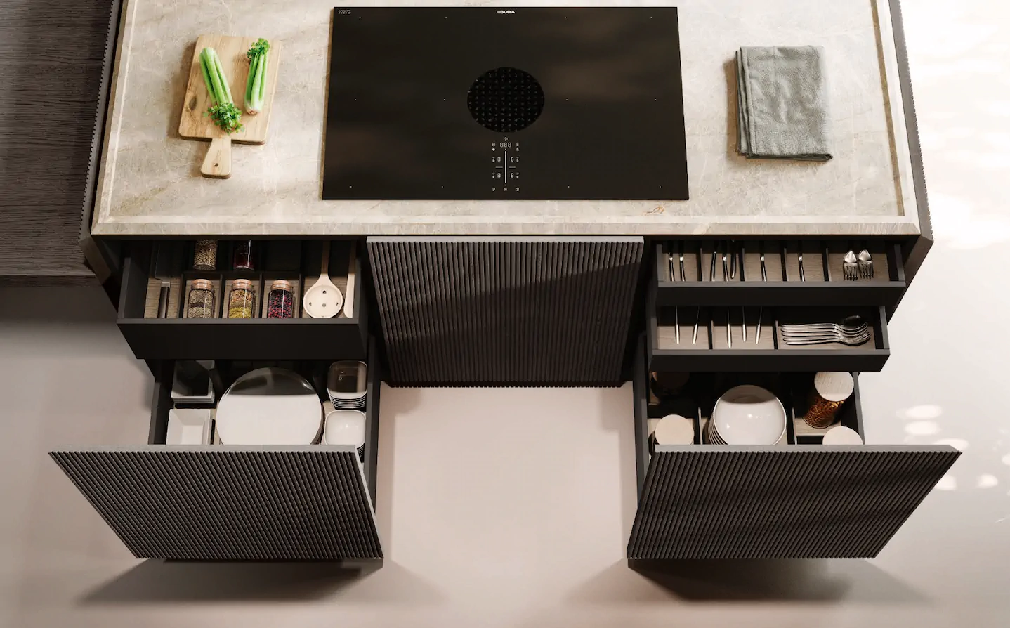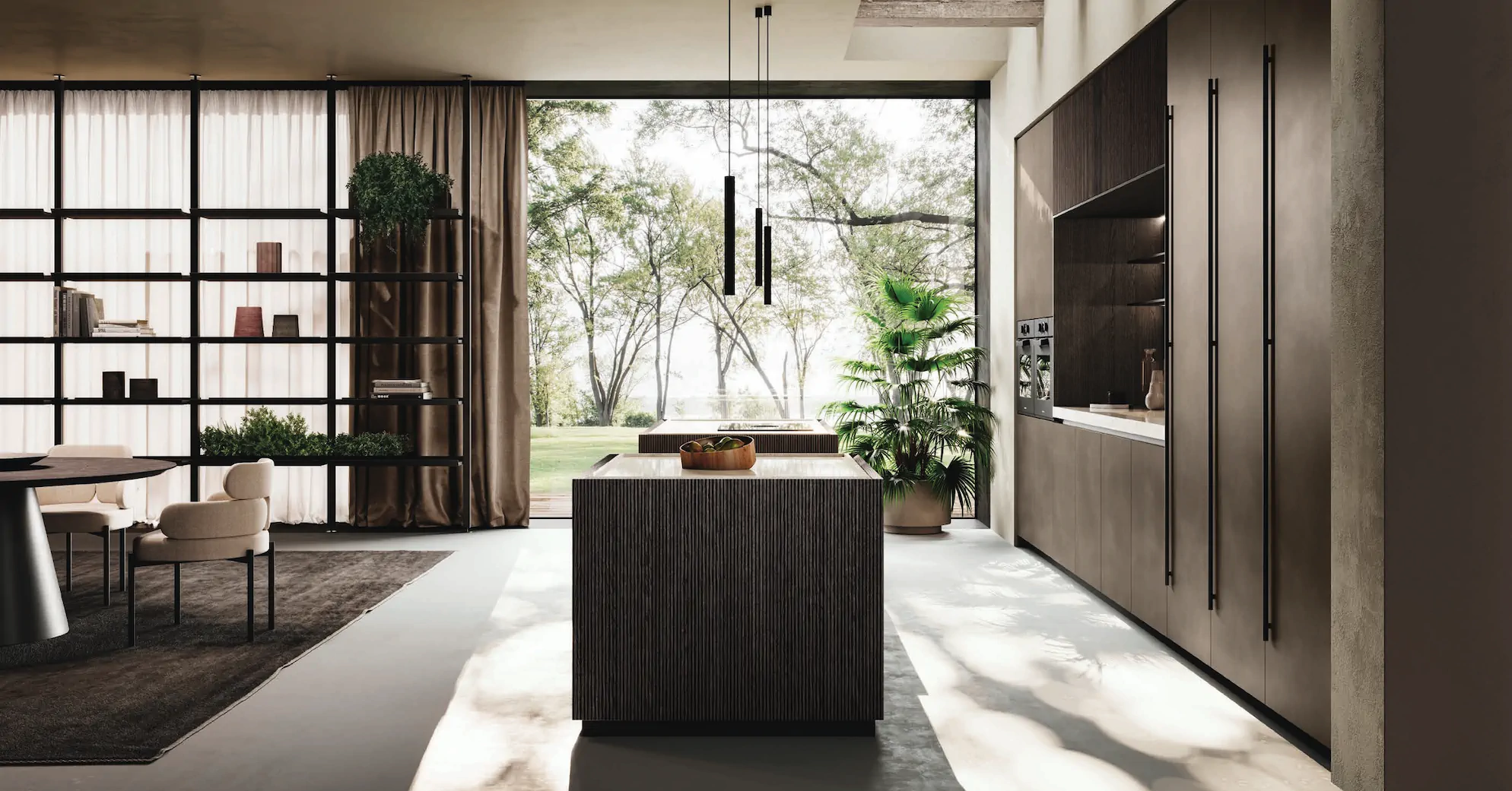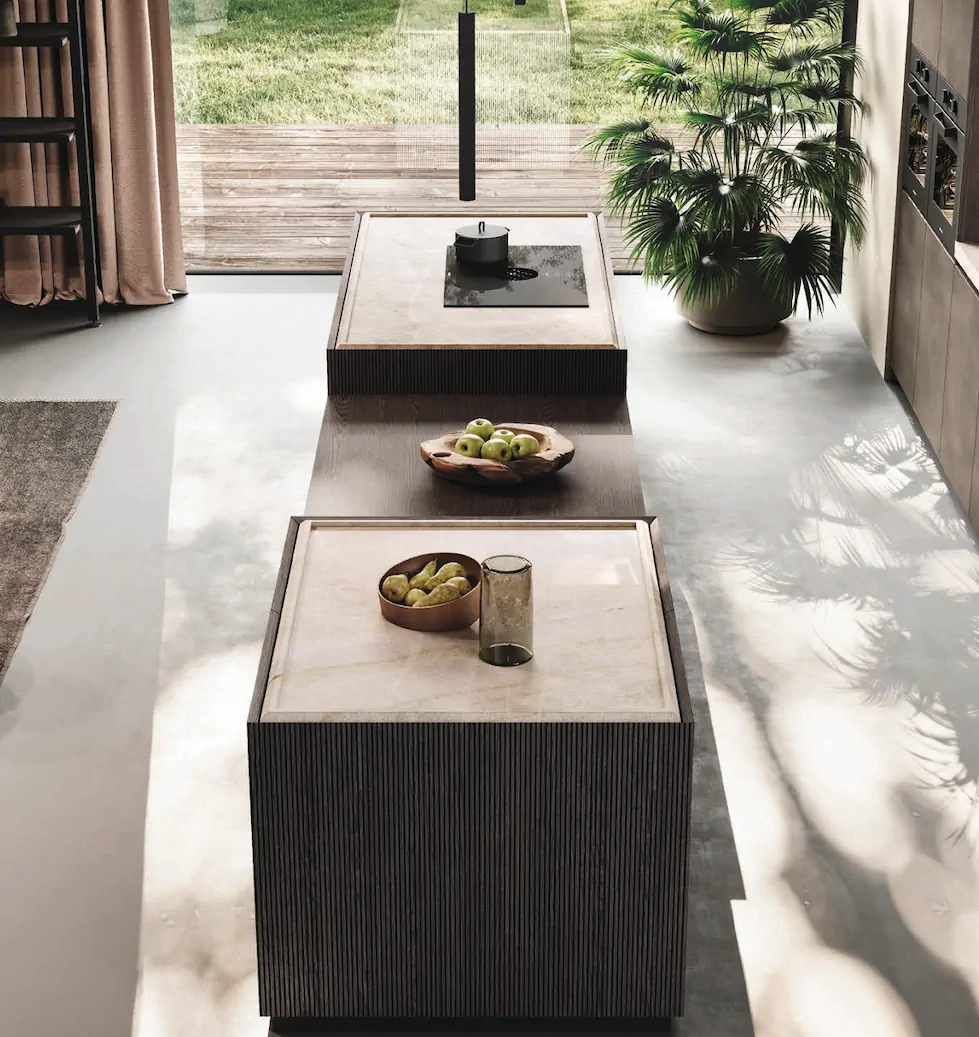 BLUNA LEGNO RIGATO propose un îlot central aux façades nervurées en bois finement fraisées, associé à un plan de travail Spiga en grès Taj Mahal Silk pour un contraste élégant. Les colonnes Bluna Laccato Metal 4.0 en finition Piombo offrent un poste de travail avec évier intégré et une cave à vin vitrée en point focal. L’espace de vie en Rovere Grigio Londra et Piombo reprend les mêmes codes pour une continuité naturelle entre cuisine et salon.