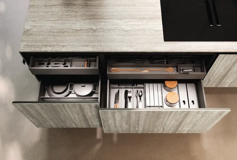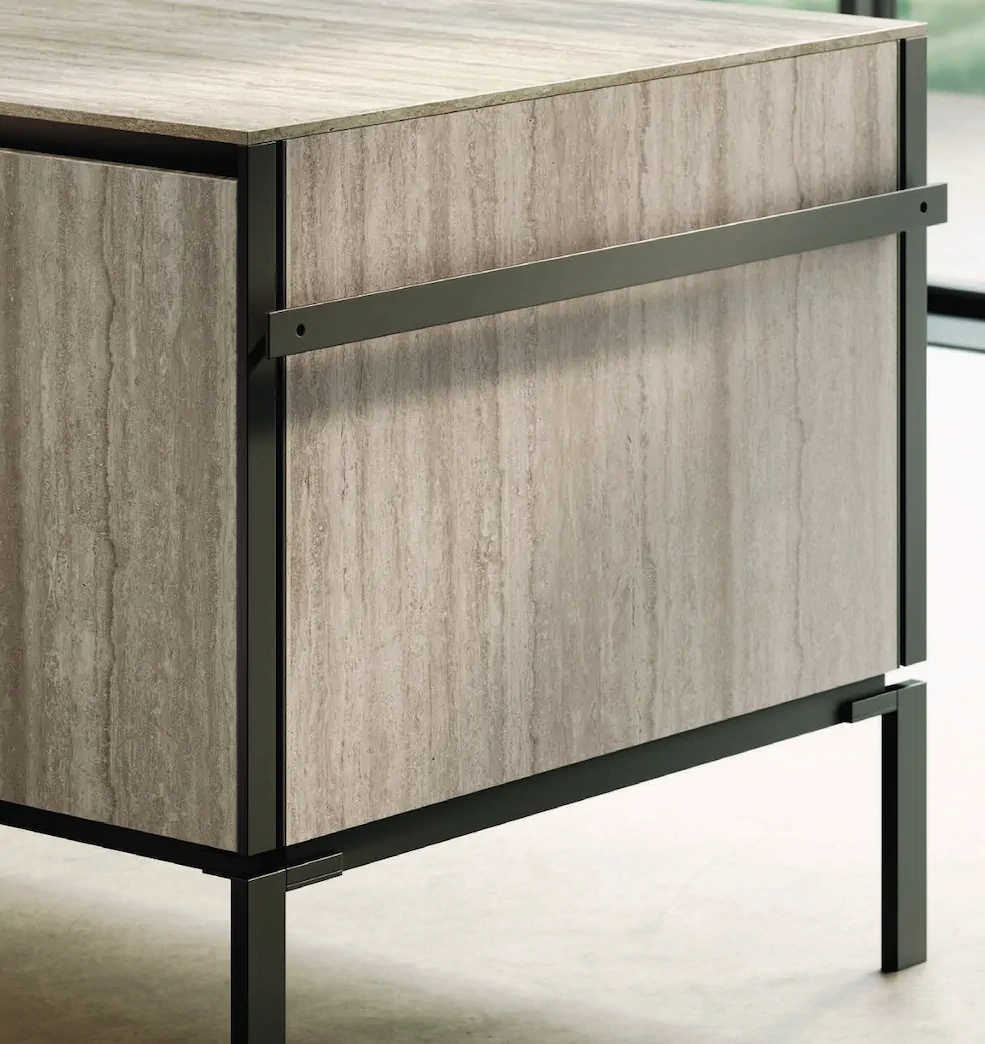 LAB GRES met en avant une courbe marquante en Bilaminate Legno Rovere Black qui conduit à deux îlots sur pieds, en aluminium noir mat avec portes en Travertino Silver Bocciardato, donnant une impression de légèreté professionnelle. La vitrine Ebe en verre, structurée par des cadres en aluminium noir, fait écho aux bases de la cuisine. Dans le salon, un mur de vie en panneaux bi-matériaux dialogue entre Rovere Black et porcelaine Travertino Silver Bocciardato, assurant une continuité forte entre cuisine et espace de séjour.