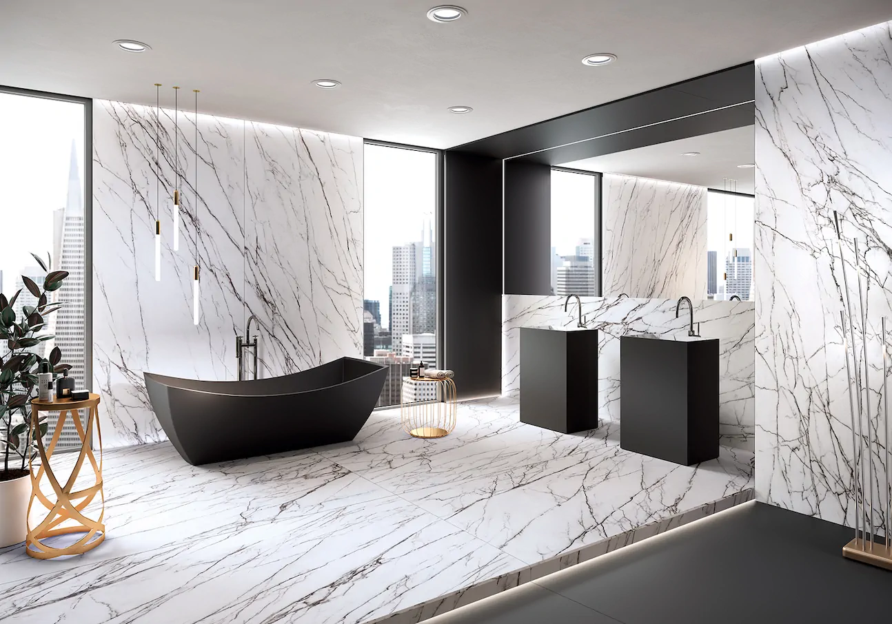 Le nom Lilac s’inspire d’un marbre naturel d’origine orientale, une variété fine, où une légère nuance violette est libérée au niveau du point de virage du fond blanc aux veines noires, nettes et prononcées. Cette particularité unique est fidèlement rendue par les graphismes qui évoquent l’idée d’un paysage émotionnel aux traits enchantés et figés dans le temps. Disponible dans une large gamme de grands et moyens formats, Lilac est parfaite pour réaliser le revêtement des sol et des murs et les applications les plus variées et innovantes, des créations emblématiques de la décoration d’intérieur, telles que les tables et les lavabos, aux élégantes façades où elle est utilisée pour créer un mur ventilé. LILAC est une dalle céramique de dernière génération : l’effet extrabrillant de la surface a été obtenu grâce à l’utilisation des grenailles spéciales lors de la production.