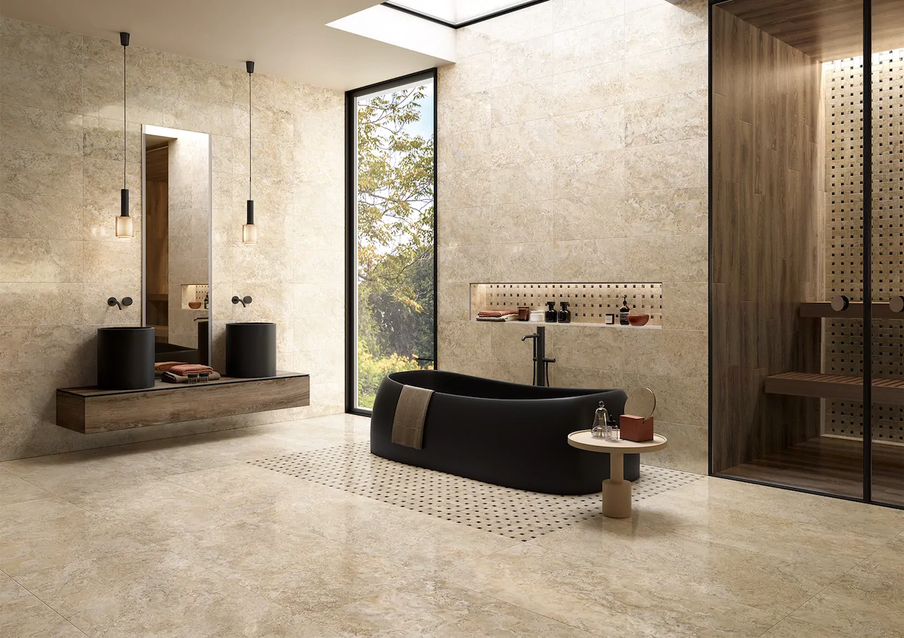 « Précieux travertins italiens, onyx sinueux du Moyen-Orient, marbres africains chamarrés : les matériaux les plus riches et les plus précieux des domaines romains se retrouvent dans le revêtement de l’un des monuments les plus fascinants de l’empire : le Panthéon. Une multitude de genres et de styles comme pour représenter la diversité de tous les dieux auxquels ce temple était dédié. Ce sont ces styles, ces couleurs, cette force qui ont inspiré la collection ROMA, une série classique et précieuse qui a su apprivoiser et fusionner tous les différents traits distinctifs de chacun de ces superbes matériaux naturels en un projet unique et original. »