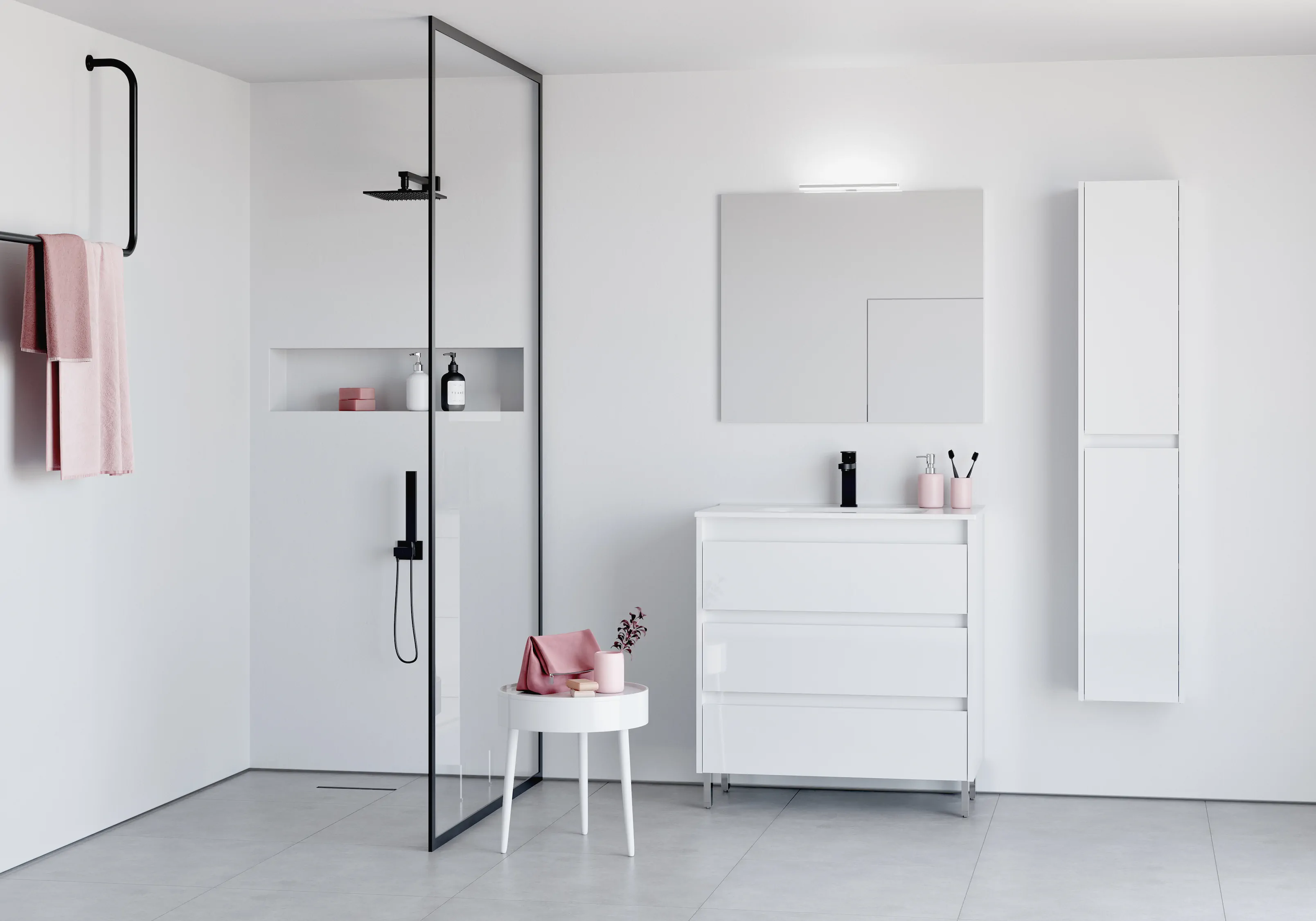 Design intemporel avec une large gamme Poignée intégrée Intérieurs des tiroirs en textile gris Grande capacité de rangement à l’intérieur des tiroirs. Glissières d’extraction partielle Hettich Meuble avec option en tiroirs, portes ou tiroirs et portes Système soft close Dimensions de 60 à 140 cm