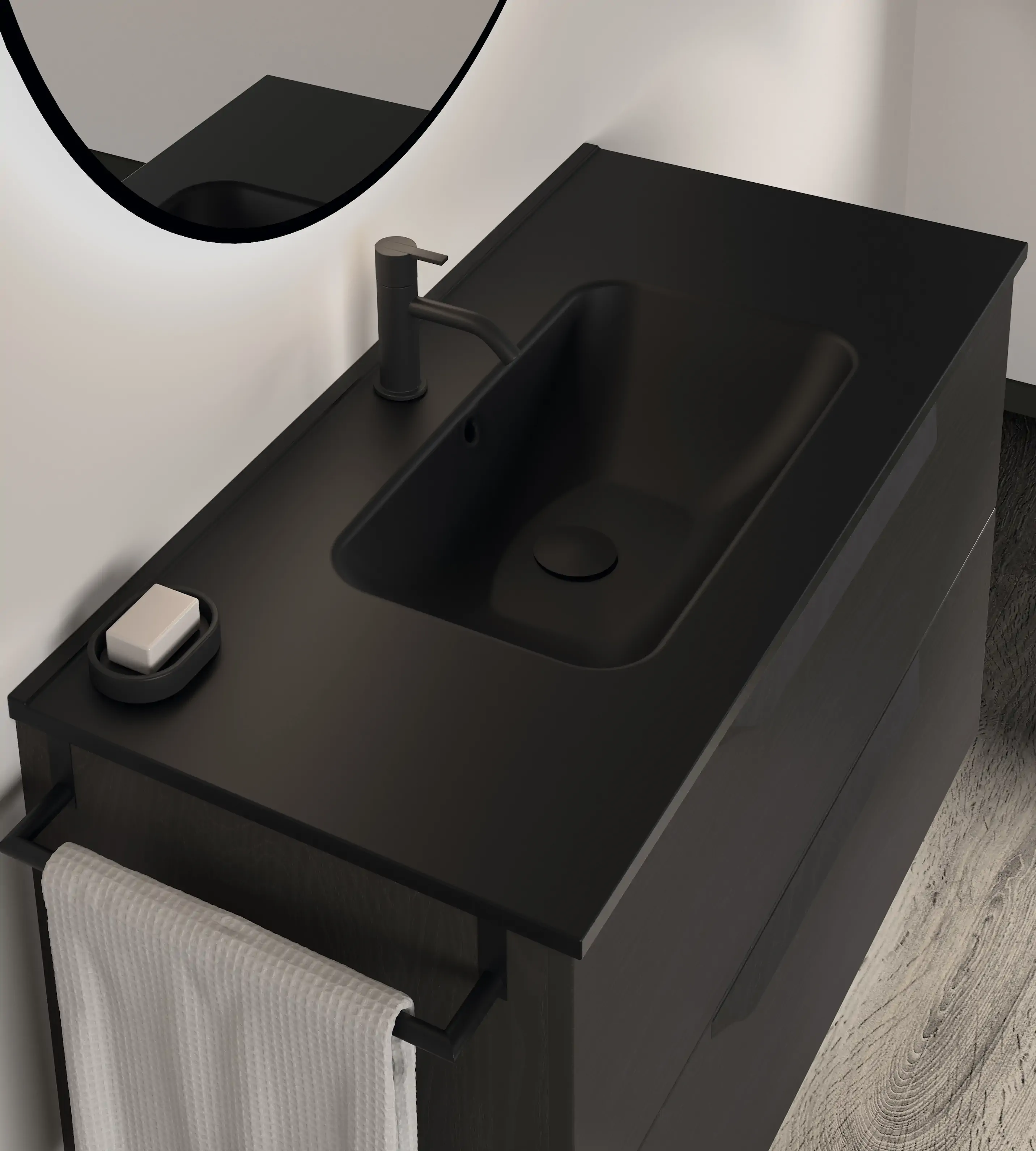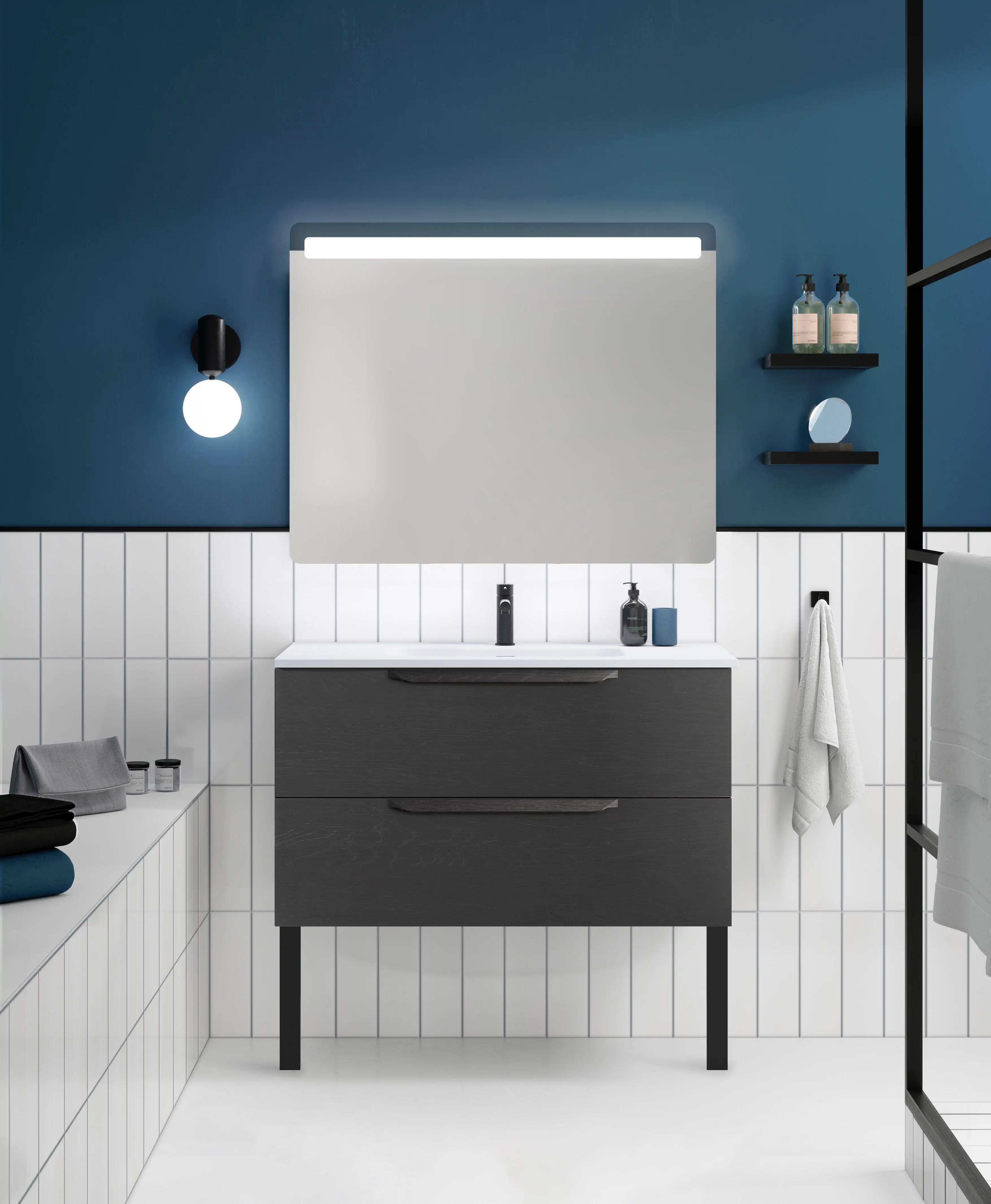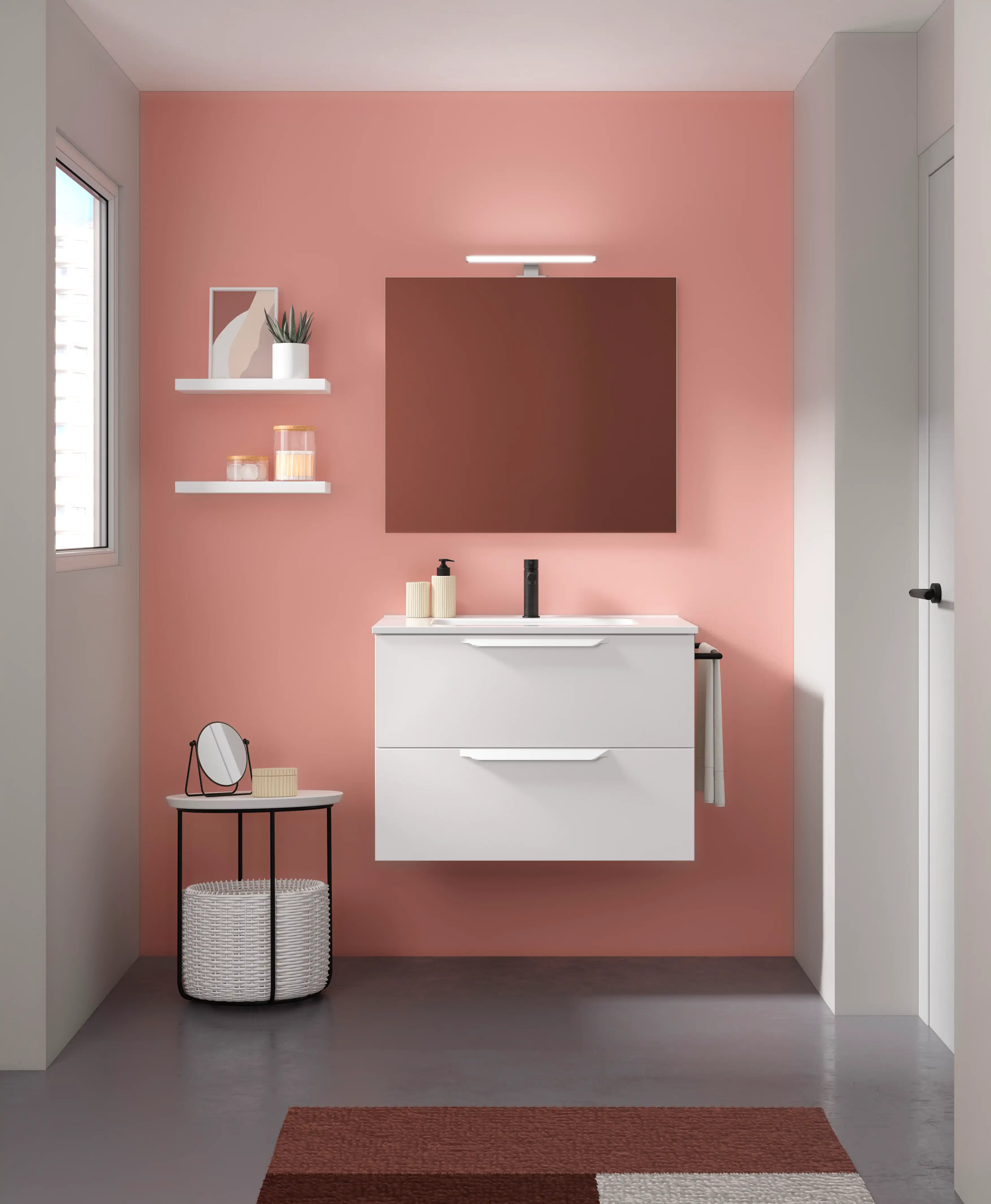 Un design à la gamme très variée. Système breveté permettant l’intégration de la poignée dans la façade qui, en la recouvrant, donne l’impression d’être une seule pièce revêtue. Intérieur du tiroir en couleur Textile Gris. Tiroir supérieur avec organisation de rangement. Glissières d’extraction totale Indaux. Option de pieds décoratifs Wire ou Lite en trois finitions différentes sur l’unité murale.